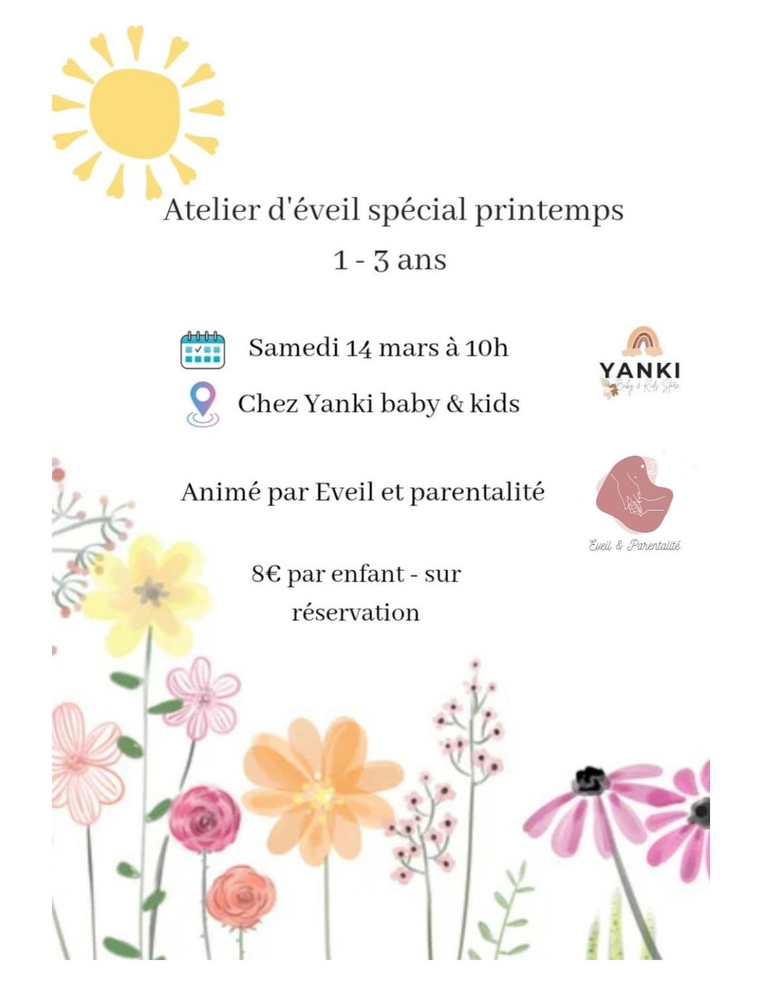 Envie d'un moment d'échange avec votre mini ? C'est l'occasion de participer à notre atelier d'éveil spécial printemps animé par Lucie (Eveil et parentalité).