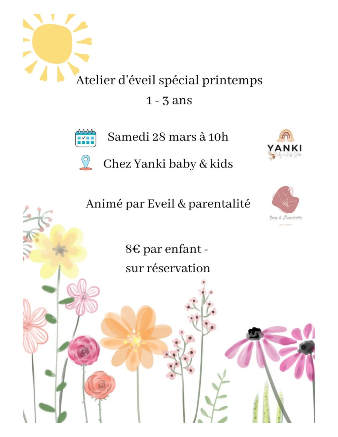 Envie d'un moment d'échange avec votre mini ? C'est l'occasion de participer à notre atelier d'éveil spécial printemps animé par Lucie (Eveil et parentalité).