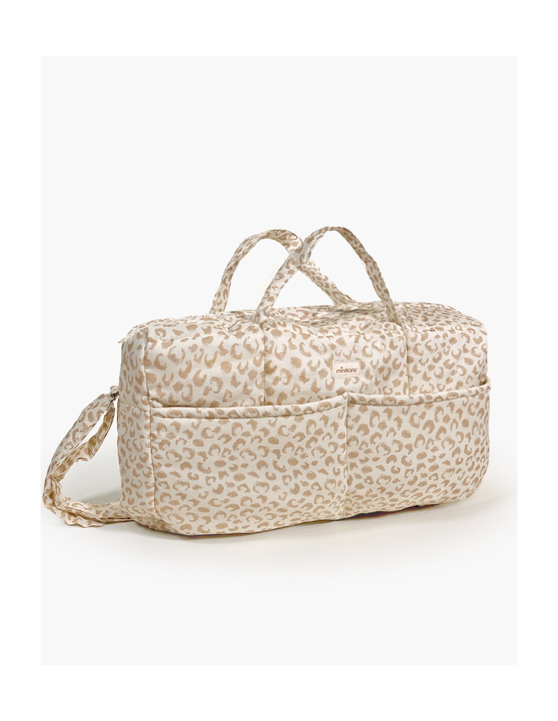 Sac à langer en coton double gaze imprimé et ouaté avec pampille et fermeture éclair. Tissu doux et intérieur en coton uni pour ranger les affaires de bébé.