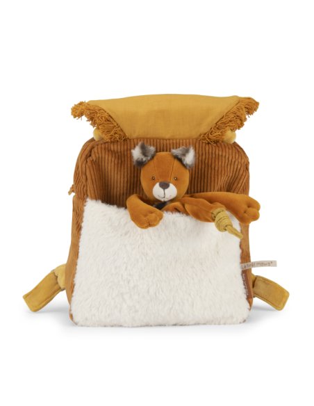 En velours côtelé et en fourrure, Mamba le lion se transforme en un sac à dos pratique grâce à sa poche avant plaquée, sa fermeture à zip et ses bretelles réglables. Muni d'un crochet porte-manteau, il sera idéal pour les premières sorties. Brodable.