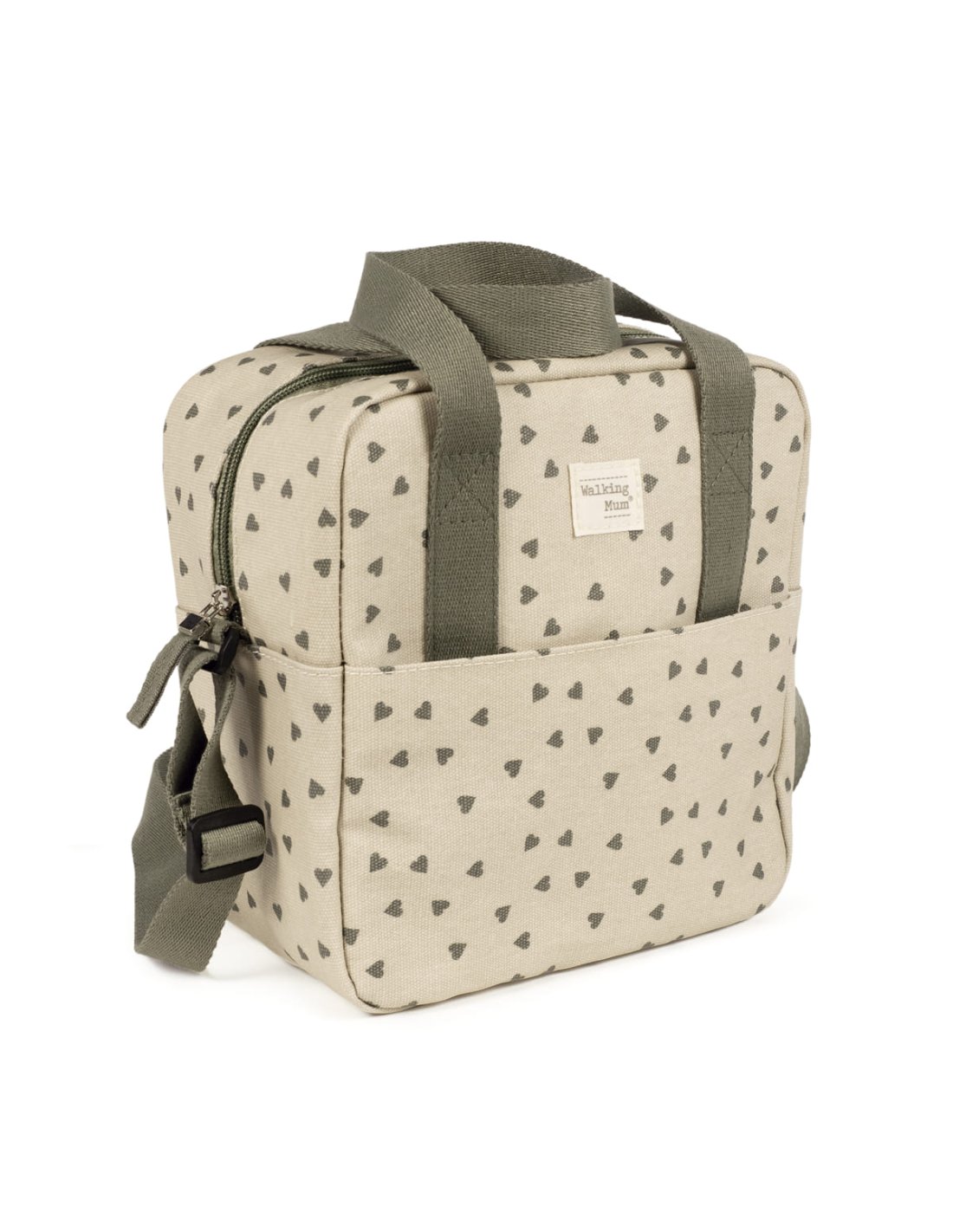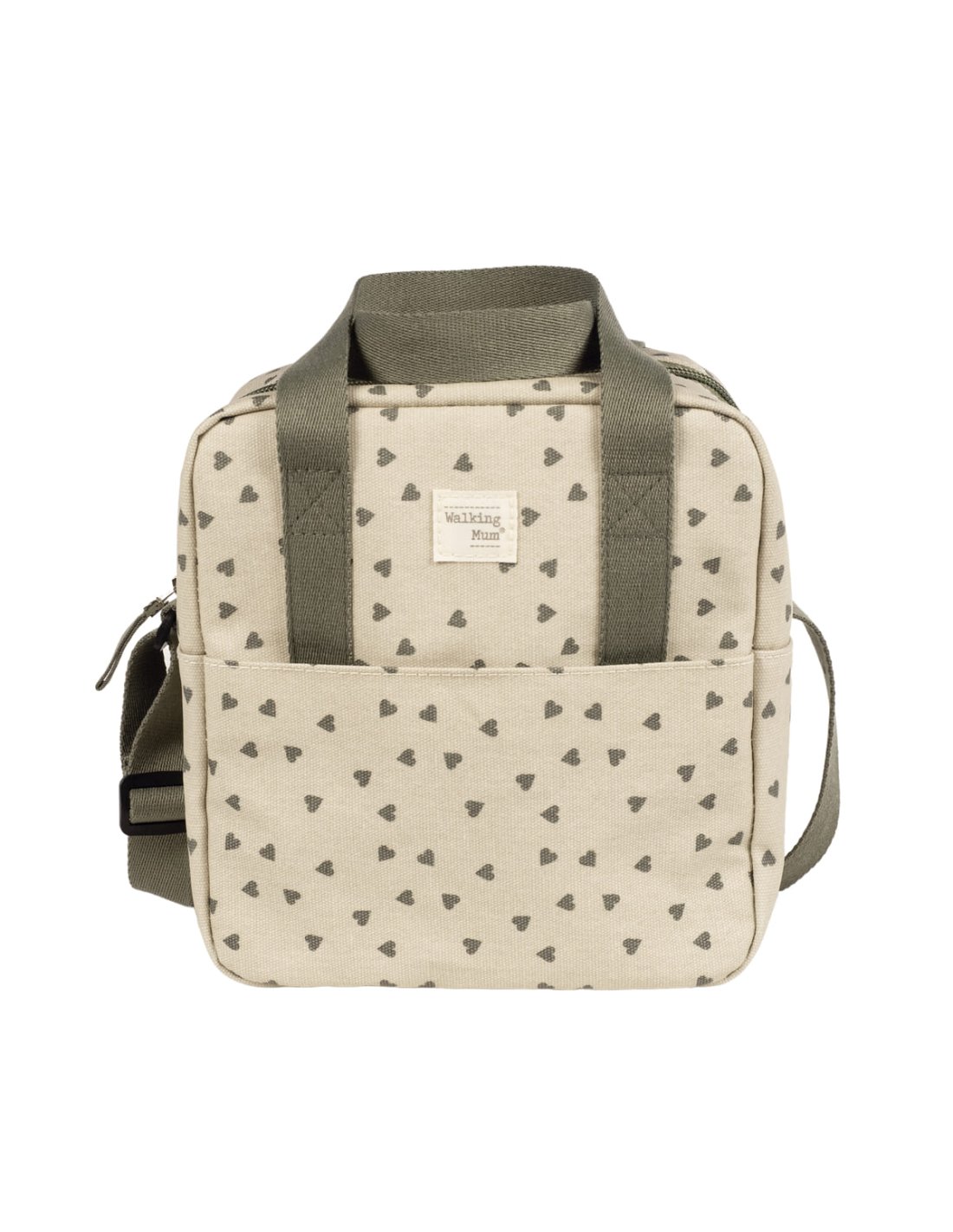 Sac isotherme coeurs cannelle. Garde la température pendant 4 heures. Il comprend également une longue poignée pour le suspendre à l’épaule et une poignée courte pour le tenir à la main.