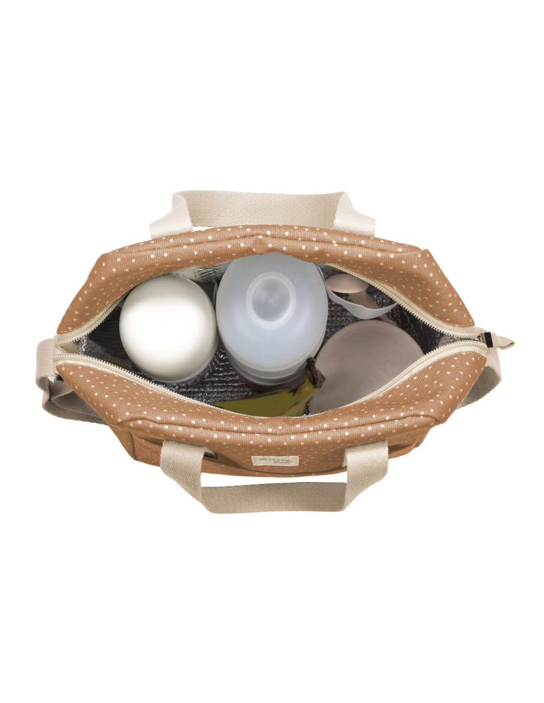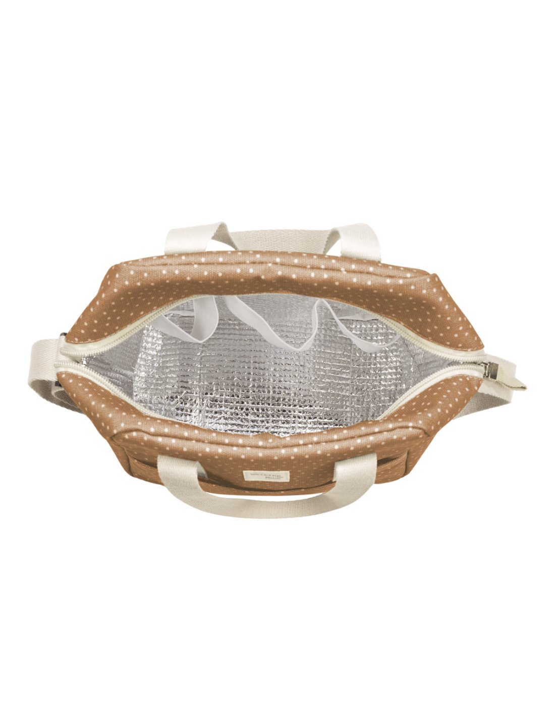 Sac isotherme pois cannelle. Garde la température pendant 4 heures. Il comprend également une longue poignée pour le suspendre à l’épaule et une poignée courte pour le tenir à la main.