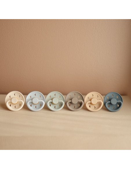 FRIGG Moon Phase est une sucette inspirée par la lune en mouvement. Les phases changeantes de la lune sont reflétées sur le bouclier de la sucette et servent de trous d'aération pour ventiler la peau sensible du bébé.